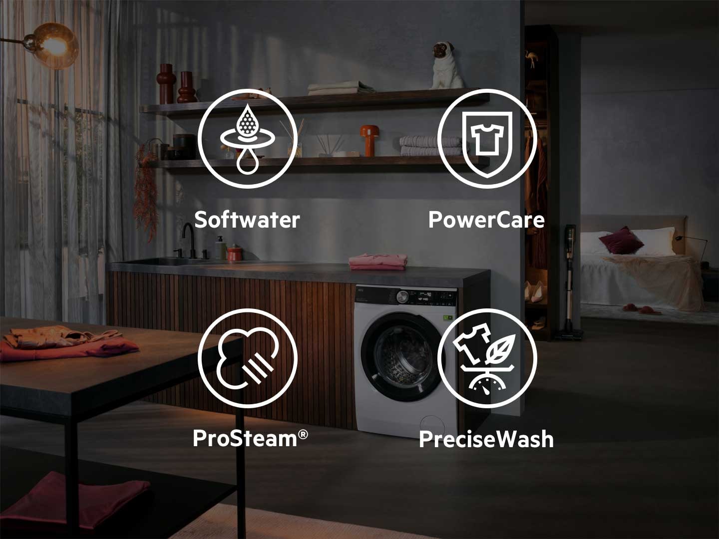 Vaskemaskinen 9000S AbsoluteCare® har en unik og nytenkende teknologi som filtrerer og renser vannet som brukes. Fargene falmer ikke*, og du får den beste klespleien hvor klærne beholder formen med færre krøller**.