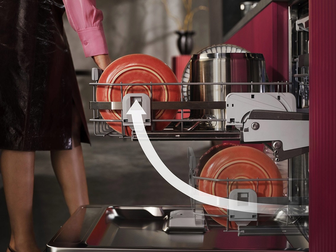 Oppvaskmaskinen 9000 ComfortLift® er den første av sitt slag med den unike mekanismen som hever den nedre kurven opp til en behagelig arbeidshøyde.