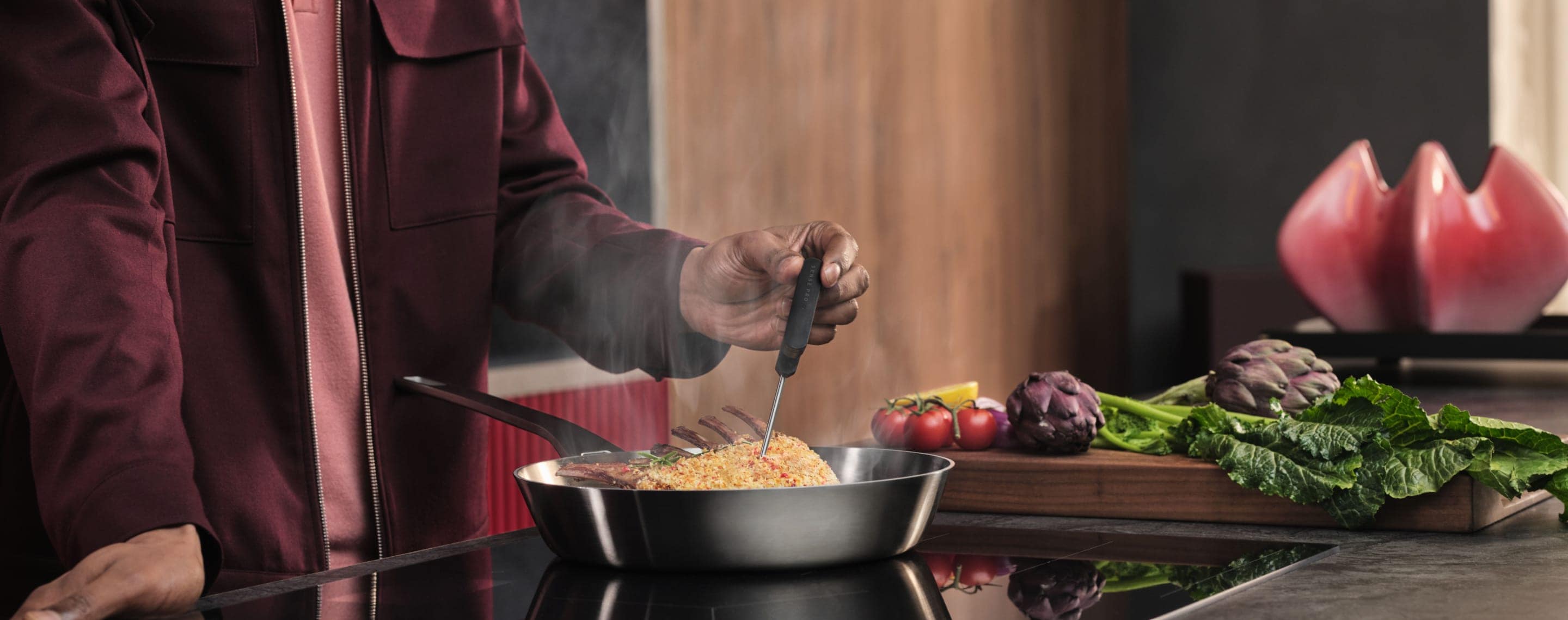 Det trådløse steketermometeret måler nøyaktig matens kjernetemperatur og justerer automatisk platetoppens innstillinger for et perfekt sluttresultat. Utmerket til koking, steking og sous vide.